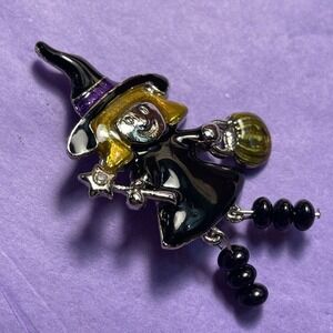 Get ready for Halloween with this silver tone enamel brooch pin featuring a trick or treating witch with articulated beaded legs and a jack-o-lantern basket to hold her candy. The black, purple and orange enamel, rhinestone star fairy wand, bright silver tone metal and beaded legs create a high-quality, whimsically detailed piece that is sure to bring smiles to people’s faces.