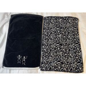 Add a spooky touch to your kitchen with this goth-inspired Halloween towel set. Includes one black towel with embroidered dancing skeletons and one mismatched towel with a bold white spiderweb print. Perfect for witchy kitchens, haunted house decor, or creepy cute year-round vibes.