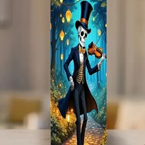 Enjoy your favorite drinks in style with this unique stainless steel insulated skeleton violinist themed tumbler. Featuring a vibrant design with shades of blue and orange, this tumbler is perfect for adding a touch of whimsy to your drinkware collection & the holiday season. All other Specifications are noted on Pictures. $25.00 plus Shipping.