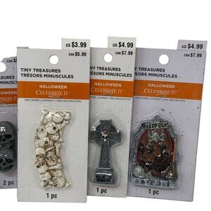 Retired Celebrate It Tiny Treasures skeleton and tombstone Halloween minis make the perfect spooky additions to fairy gardens, tiered trays, and haunted displays. Creepy Celebrate It Tiny Treasures skeleton and tombstone miniatures. Includes coffin skeleton, RIP graves, skulls, and spooky cemetery accents. Perfect for Halloween crafting displays.