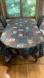 - The tablecloth has print that reads: evil spirits, highly potent, 31, boo, and images of skulls, crows, blue leaves, spiders & webs. Colors of blue and burgundy with a golden sheen. Approximately 82.5 x 58.5” (inches) Rectangle shape but shown on an oval table in photo.