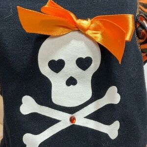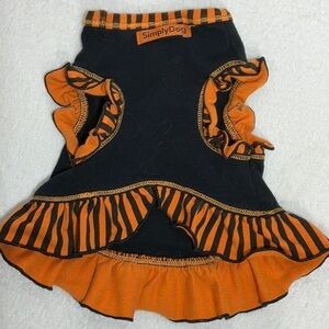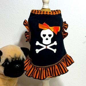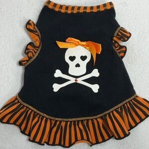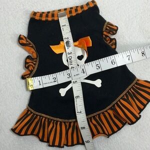 Dress your pet in style with this black and orange skull dress. Perfect for Halloween or any occasion. Measurements pictured. Size XS.