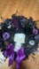 Decorative wreath featuring a skull centerpiece. Adorned with purple flowers and a bow. Perfect for Halloween decor.