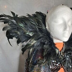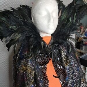 Dramatic statement piece casts a spell of captivating allure. This shimmering black cape, overlaid with a striking spiderweb pattern in vibrant hues, is instantly eye-catching, while the grandiose black feather collar frames the face in gothic drama. The cape ties securely with elegant black ribbons and features an open front that allows for layering. The intricate details and bold design make this cape a perfect centerpiece for Halloween parties, costume events, cosplay gatherings, rave outfits, or adding a touch of dark elegance to gothic fashion ensemble.