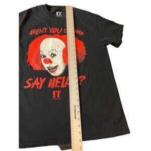 Get ready for Halloween with this spooky IT Movie t-shirt featuring the iconic IT face graphic in black. Made with all-seasons cotton material, this regular fit t-shirt is perfect for any unisex adult looking to add some Stephen King horror to their wardrobe. The shirt has short sleeves and a crew neckline, making it comfortable for any occasion. The solid black color pairs well with any outfit and the IT Movie branding adds a touch of fandom. This t-shirt is a must-have for any IT Movie fan looking to show off their love for the horror genre.