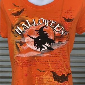 🛍️Halloween T- shirt short sleeve orange Holiday witch on broom and writing