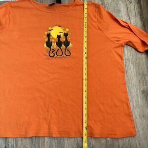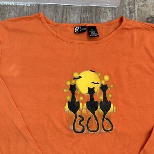 Holiday Editions vintage Halloween t-shirt for women, size 2X, in orange and black with a cats and moon design. Fun and festive, perfect for fall, Halloween celebrations, or adding a retro spooky touch to your wardrobe.