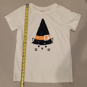 Cute Halloween shirt with reversible sequins. Just run your hand over the sequins to change the hat from black/orange band to purple/silver stars. Youth Size XL.