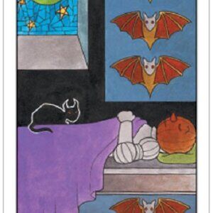 A black cat with glowing eyes leads us on our nocturnal sojourn through the 78 cards of the Major and Minor Arcana. The characters of the Major Arcana visit from the realms of horror stories and Halloween tradition. Frankenstein and his bride 'bring to life' the Emperor and the Empress cards. The Minor Arcana suits are Pumpkins, Imps, Ghosts, and Bats, each with a special significance. This is a pocket-sized deck.
