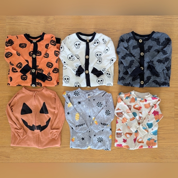 Set of six Celebrate Halloween baby onesies. Features pumpkin, skull, bat, and fall designs. Perfect for festive occasions. Size 6-9 Months