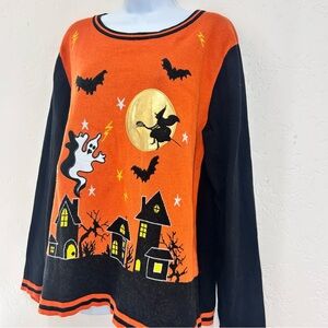 Halloween Themed Orange and Black Sweater 100% Cotton L/XL Witch Haunted House