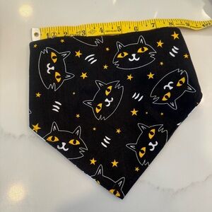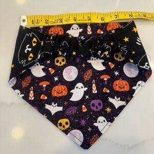 Festive Halloween bandana featuring ghosts, pumpkins, and skulls on one side and black cats on the other side. Perfect for spooky celebrations. See photos for measurements. Will stretch 1”. I am not a professional seamstress. Scrunchie band.