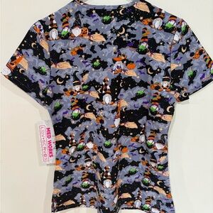 Colorful Halloween themed scrub top with playful patterns. Perfect for festive occasions.
