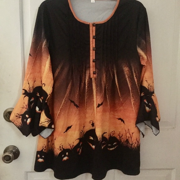 Beautiful new shirt for Halloween. Bright orange and black with Jack o lanterns and bats. This top has front buttons and bell sleeves and made out of a stretchy fabric. It is a size Large. Never worn but no tags.