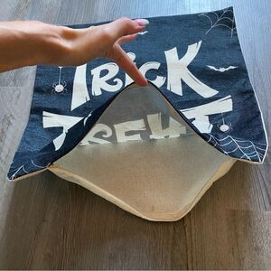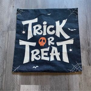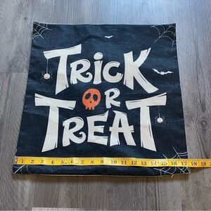 Spook up your Halloween decor with this Trick-Or-Treat square pillowcase. Zips over any pillow of this size to transform it for the spooky season. Please see photo section for approximate flat measurements. Excellent condition.