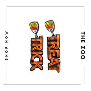 Get ready for Halloween with our TRICK TREAT Earrings! Perfect for adding a festive touch to your spooky season outfit, these earrings spell out "TRICK" on one ear and "TREAT" on the other, each topped with a delightful candy corn detail.