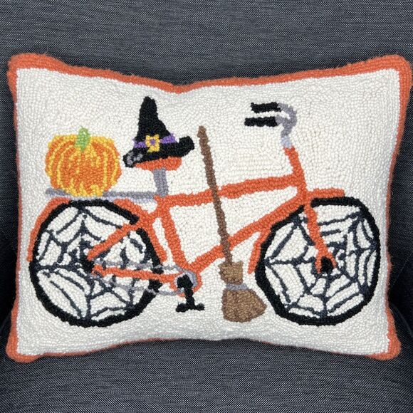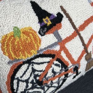 Halloween Witch Bicycle Hooked Wool Throw Pillow 17 X 14 Spider Webs