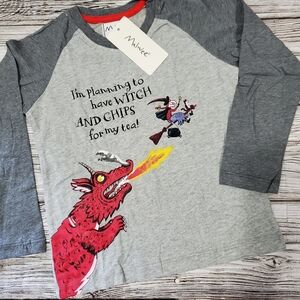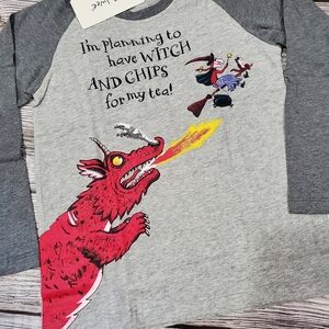 This kids long-sleeve raglan features a bold dragon design with a whimsical slogan inspired by Room On The Broom book by Julia Donaldson.