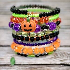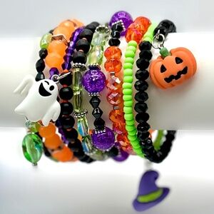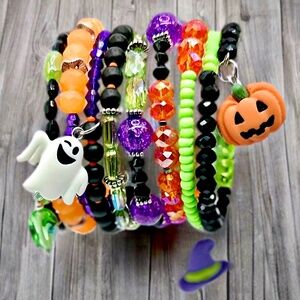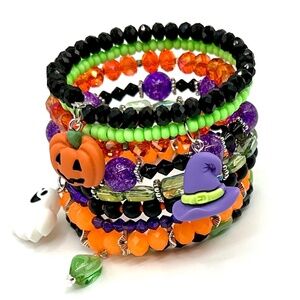 Get into the Halloween spirit with this handmade beaded wrap bracelet made on 9 rows of memory wire featuring a fun mix of glass beads, crystals, cracked quartz beads, silver spacer beads, a handmade crystal drop on one end and 3 adorable Halloween charms: a ghost, a pumpkin, and a witch hat. It is made with mostly black beads and is complimented with delightful colors of orange, purple, and green. It adds the perfect touch to any Halloween parties, costumes, or even just a festive piece to wear during that spooky autumn time of year!