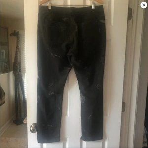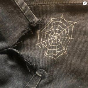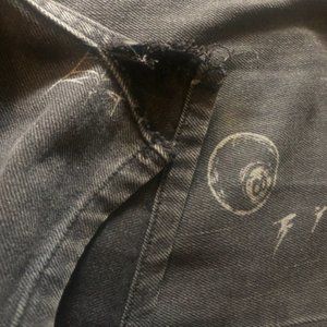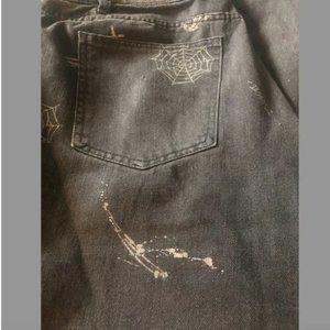 Black wash denim. Perfect as a base for a Halloween Costume or just for everyday wear. Covered with spiders, webs, splashes, eight ball, etc., and a perfectly placed tiger on the fly. 30" inseam