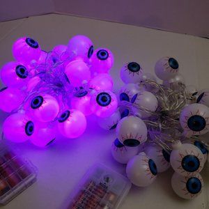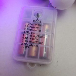 The light is purple. There are 8 settings on the battery pack. Each string is 20. Take 3 AA batteries which are NOT INCLUDED. New.