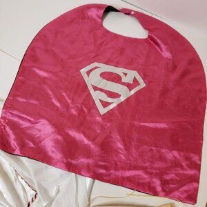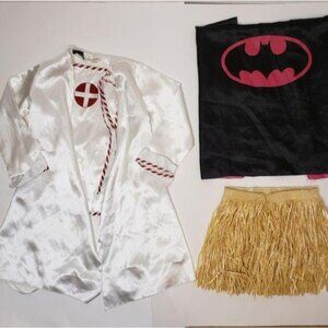 Halloween play dress up fun costumes. There is a nurse Doctor jacket apron outfit (it has a small spot of it), an adjustable Hawaiian grass skirt. And a reversible batman, superman cape. The the size on the nurse costume is 8-10. The other items are one size fits most.