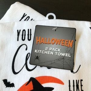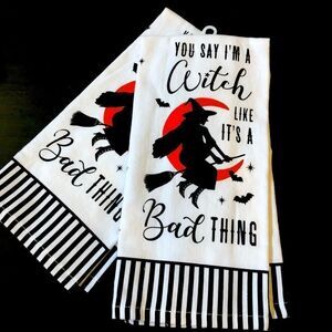 NWT set of 2 Halloween flying witch & broom silhouette cotton printed dish towels. “You Say I’m A Witch Like It’s A Bad Thing.”