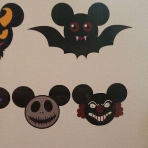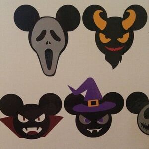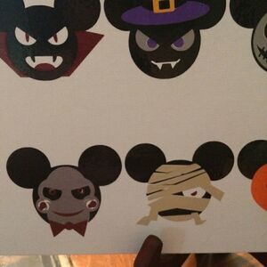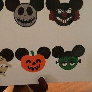 Handmade item inspired by Halloween and Disney! 11 Mickey Mouse heads dressed in various costumes for the holiday. Can be framed easily to match your own decor. Measures 11 x 14. Stand not included