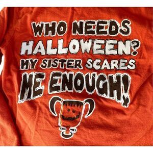 Funny Halloween long-sleeve cotton t-shirt says” Who needs Halloween? My sister scares me enough!” Size XS 4/5. Good condition.