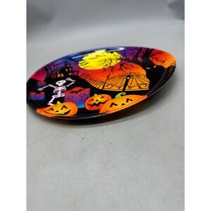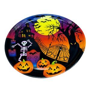 This vibrant Halloween-themed plate features a spooky design with a skeleton, jack-o'-lanterns, and a haunted scene, perfect for adding flair to seasonal decor. Crafted with quality materials, it's designed for decorative use and can be an eye-catching addition to any festive setup.