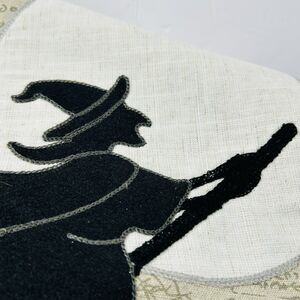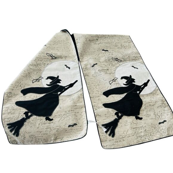 Features witch on her broom flying by the moon with outline stitching. Material has a script background, and the back is solid black. Measures about 14" wide X 70" long. Very nice pre-owned condition.