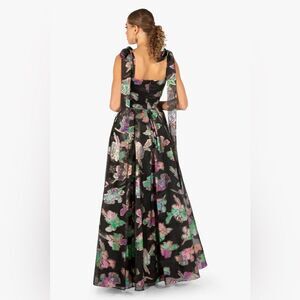 Vibrant flowers bloom on this dreamy jacquard gown fashioned with dramatic tie straps at the shoulders and a full, voluminous skirt.