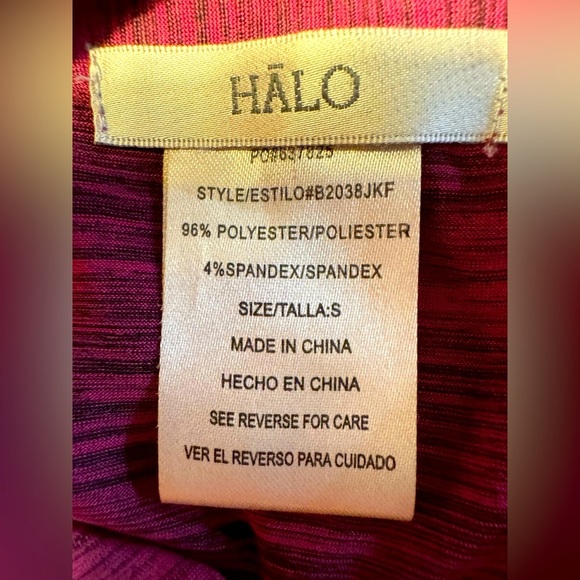 Hälo Magenta Ruffled Top - Size Small Add a pop of color to your wardrobe with this elegant Hälo magenta top. Perfect for any occasion, this top offers both style and comfort. ### Features: - **Brand:** Hälo - **Size:** Small - **Color:** Magenta - **Material:** 96% Polyester, 4% Spandex ### Measurements: - **Shoulder to Hem:** 23.5 inches - **Pit to Pit:** 21 inches - **Sleeve Length:** 6 inches ### Design Highlights: - **Ruffled Neckline:** Adds a unique and feminine touch. - **Tie Waist:** Adjustable for a perfect fit and flattering silhouette. ### Condition: - Excellent pre-owned condition, ready to wear. ### Care Instructions: - Machine wash cold - Gentle cycle with like colors - Tumble dry low, remove immediately ### Why You’ll Love It: This top is versatile and easy to style. Pair it with jeans for a casual day out or dress it up with a skirt for a more polished look. The vibrant color and stylish details make it a standout piece.