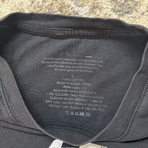 This Halo T-Shirt features a solid black color with a crew neck and short sleeves. Made of cotton knit fabric, it showcases the Master Chief Crest logo, reflecting a vintage design from the 2000s. The tee is a promotional item related to the Halo video game series for Xbox, embodying American art and retro fun themes. It is a size large with a regular fit, suitable for all seasons.