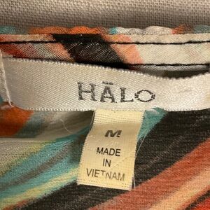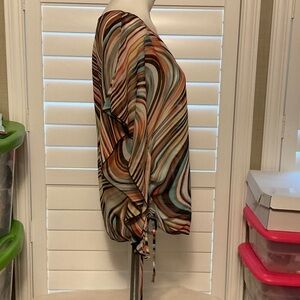 Chic and colorful blouse with a dynamic swirl pattern. Lightweight and stylish for any occasion.