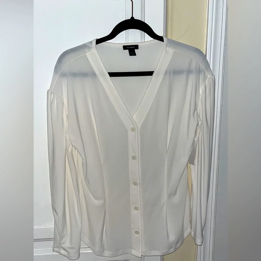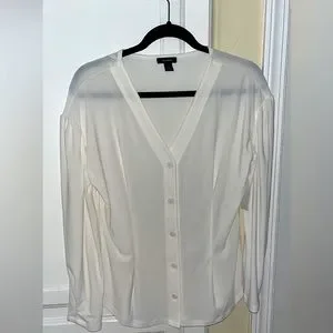 Halogen button down long sleeve top with nice detailing at wrist hem and at shoulder hem. Drop shoulder, smooth buttons. Feels like butter. Never worn.