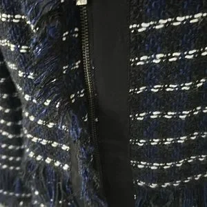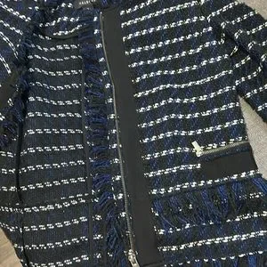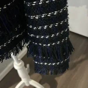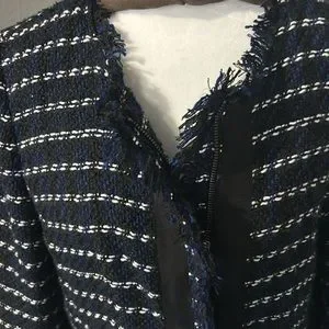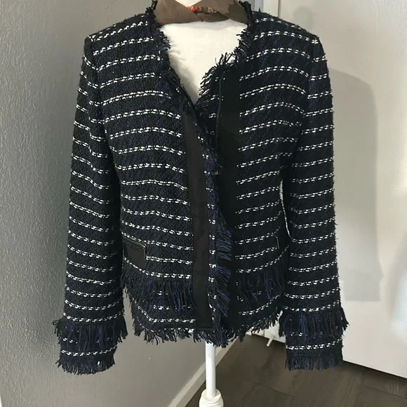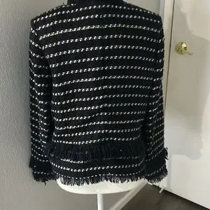 Halogen zip jacket. Gorgeous with jeans, boots and T or fancy. Fringe highlights at neck, bottom, zip closure, waist, cuffs. Black, blue, white textured knit. Lined with ribbon.