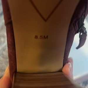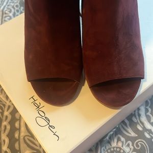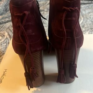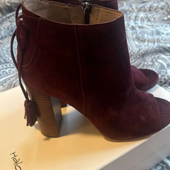 Halogen shoes- good for a night out. Supple maroon/wine suede shoe/boot with sexy peep toe. Lace up detail in the back with tassels at the end. Inside zip. Super comfortable. Wood chunk heel.