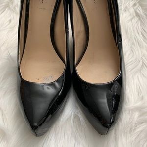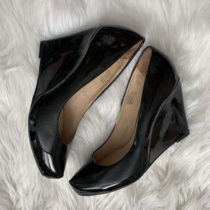 A sleek wrapped wedge with an elegantly tapered toe style - glossy patent pump!