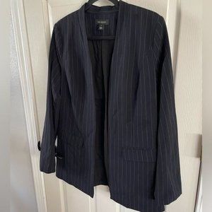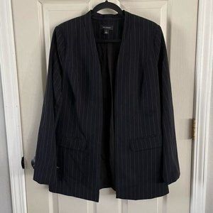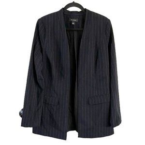Elegant black blazer with white pinstripes. Open front design. Perfect for professional settings.