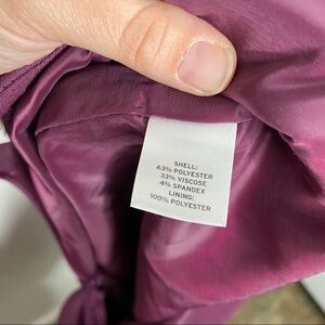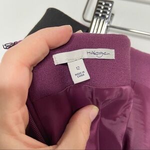 Halogen Colorblock Career Pencil/Straight Skirt. Size 12. Does have 2 very small snags near the back zipper but otherwise in great used condition. Purple and black color blocking pattern. Zipper in back, slit in back and back zipper closure. Polyester/viscose/spandex material.