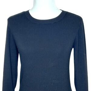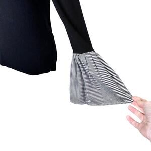 Halogen Black Sweater with Black & White Striped Bell Ruffle Sleeve. Super soft sweater with cotton bell striped sleeve. Dress up or down. Size Medium. Measurements taken laying flat: