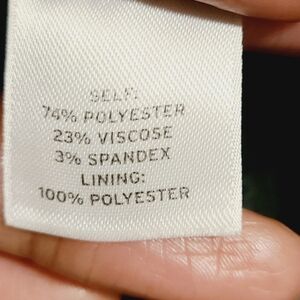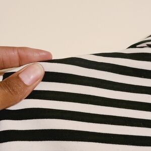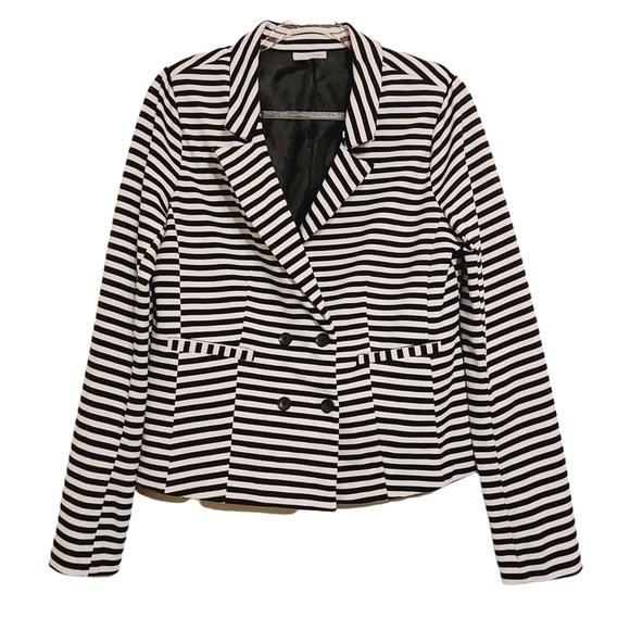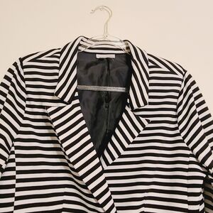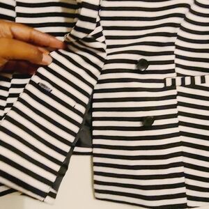 Black and white striped blazer jacket by Halogen, size large. Blazer is stretchy, has shoulder pads and fits slightly cropped. Small pockets in front. Double buttoned and lined inside. Excellent pre-owned condition; no flaws.