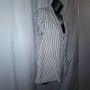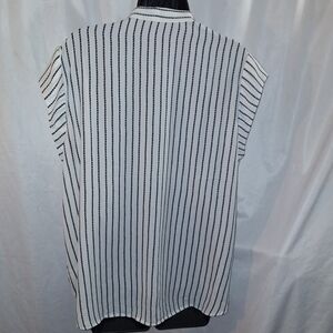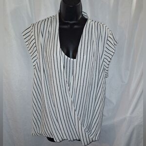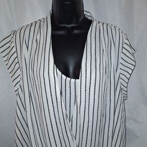 This Halogen blouse features a chic wrap design with black and white stripes, offering a relaxed and stylish look. The lightweight fabric and flowing silhouette make it a versatile addition to any wardrobe. pit to pit size is 23" top of shoulder to bottom hem is 26.5" bundle more items for bigger deals Bin-145