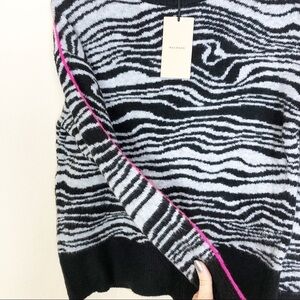 Stylish zebra print sweater. Features black and white pattern. Pink stripe detail on sleeves. Perfect for casual wear.