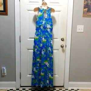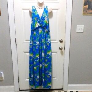 Halogen Blue Elegant maxi dress with floral pattern. Sleeveless design with pockets size small. Perfect for summer occasions. Size 1X