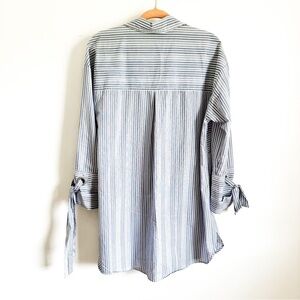 Halogen Blue White Stripe Button Down Tunic Shirt Dress. Size 1 (plus size). Excellent condition. I wear a size small to medium and am wearing it as a dress and I love that look for it, but it is also meant to be a plus size tunic shirt. Has metal grommets and tie detail at the cuffs.