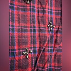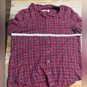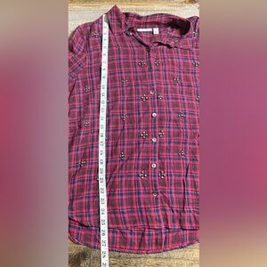 Chic burgundy plaid shirt with embellishments. Button-down style. Ideal for casual outings. Size large. Smoke free home.