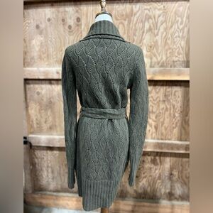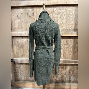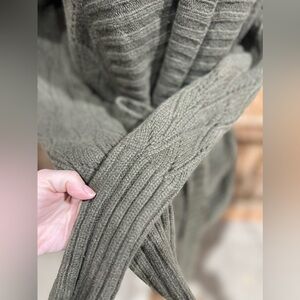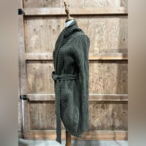 Halogen cardigan, olive green sweater, lambswool cashmere, crocheted knit, cable knit cardigan, shawl collar wrap, belted sweater coat, cozy fall layer, boho chic, business casual, lounge knit, soft wool blend, timeless neutral, women’s size small, classic olive, luxury knitwear, fall winter capsule, soft cozy texture, elevated everyday style /M