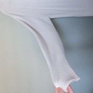 This sweater is tagged as a large, however runs really big. I wore this when I was an XXL and it was still roomy on me. Has a slightly terrycloth feel, not as rough but not super soft. Lightweight. Does stretch. Slight high low style, side split hem. Good condition. Feminine, casual, solid color, basic, simple, plain, fall, autumn, office, workplace, weekend, versatile